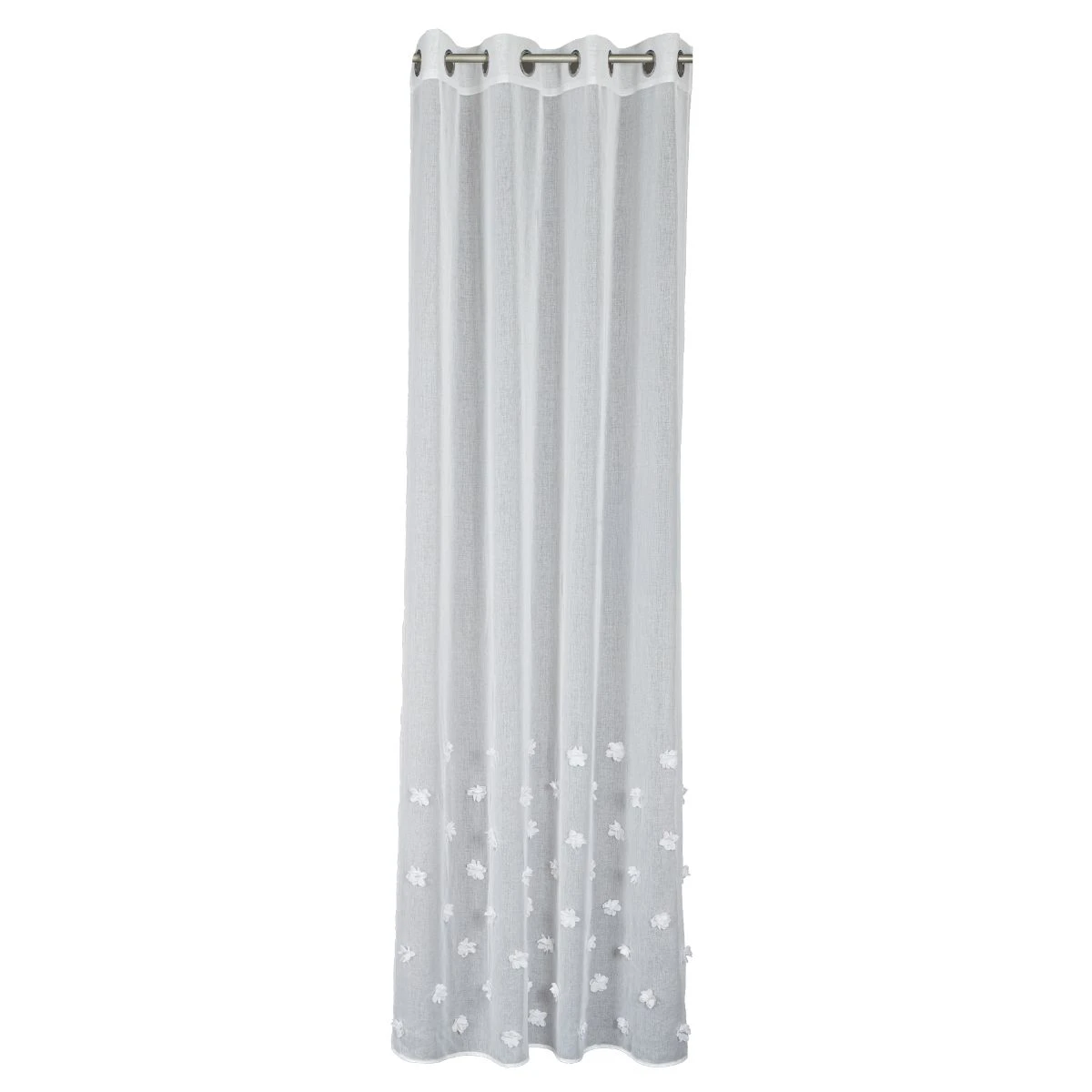 Fertige Gardine aus weißem Etamin mit feiner, kleiner Struktur, unten mit Bleiband abgeschlossen. Verziert mit einem effektvollen dreidimensionalen Blumenmuster im unteren Teil des Stoffes.