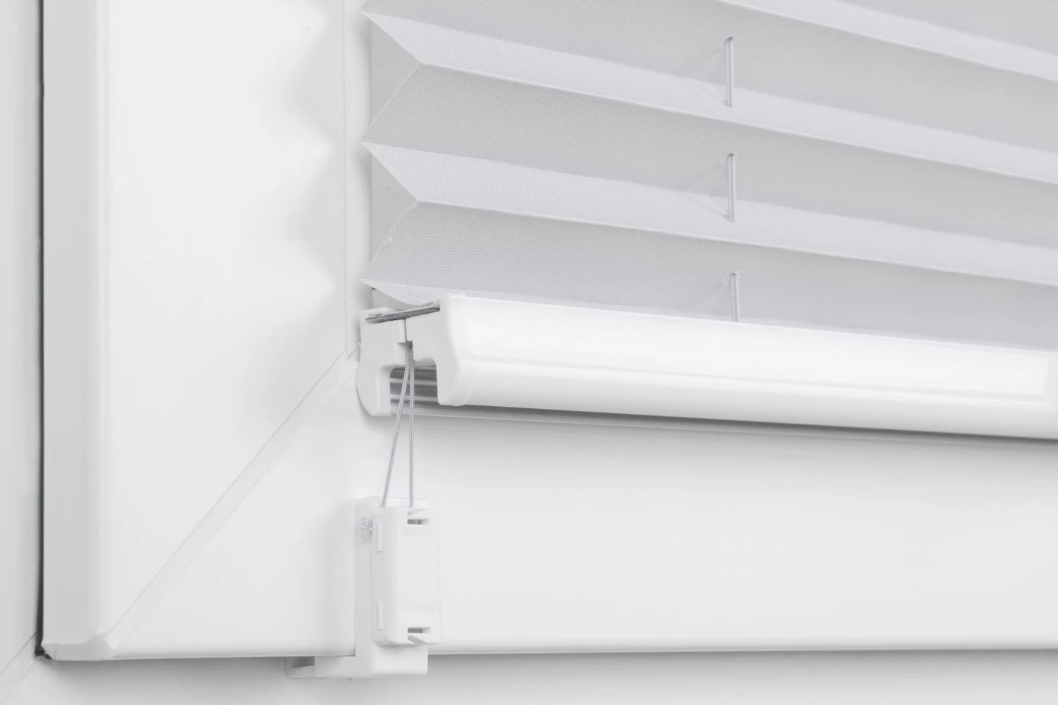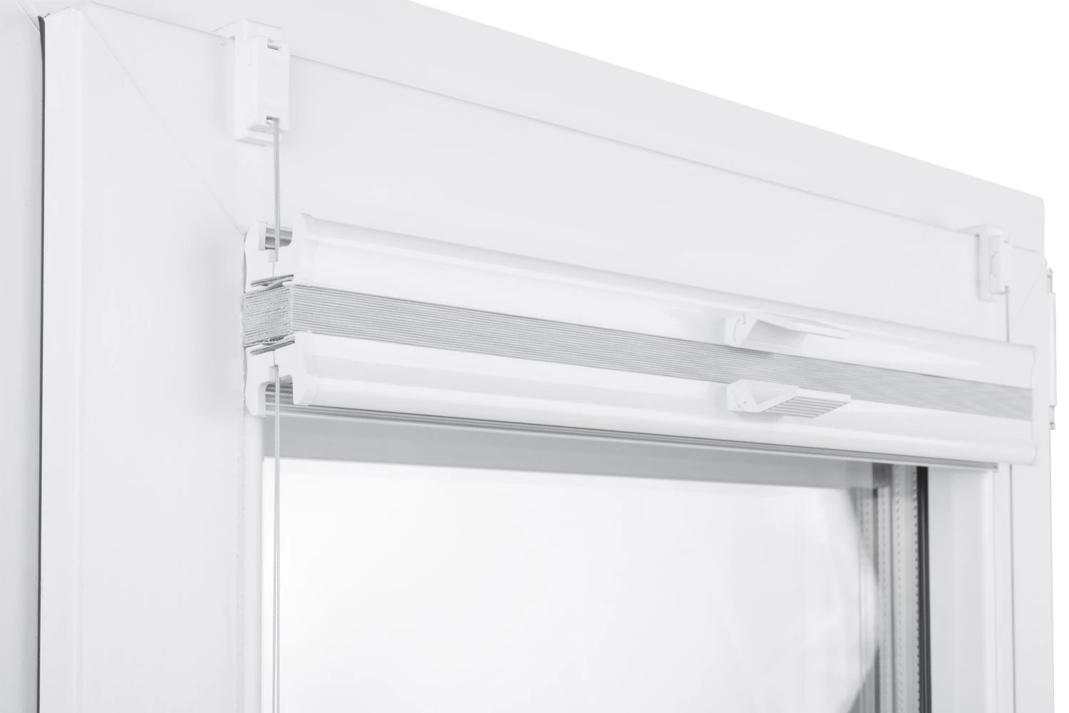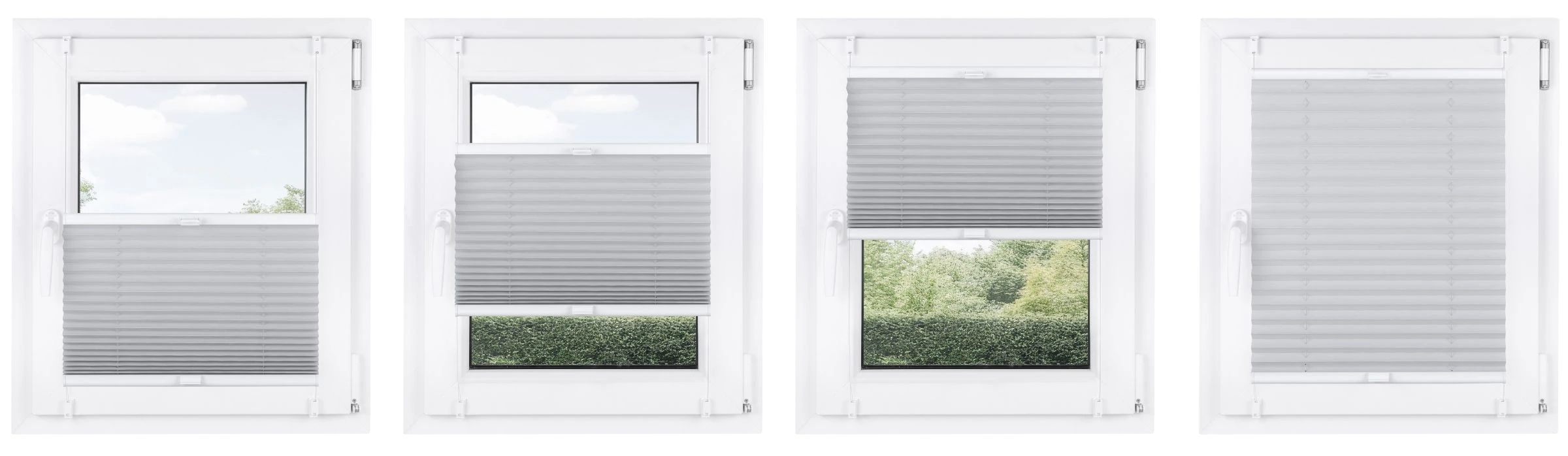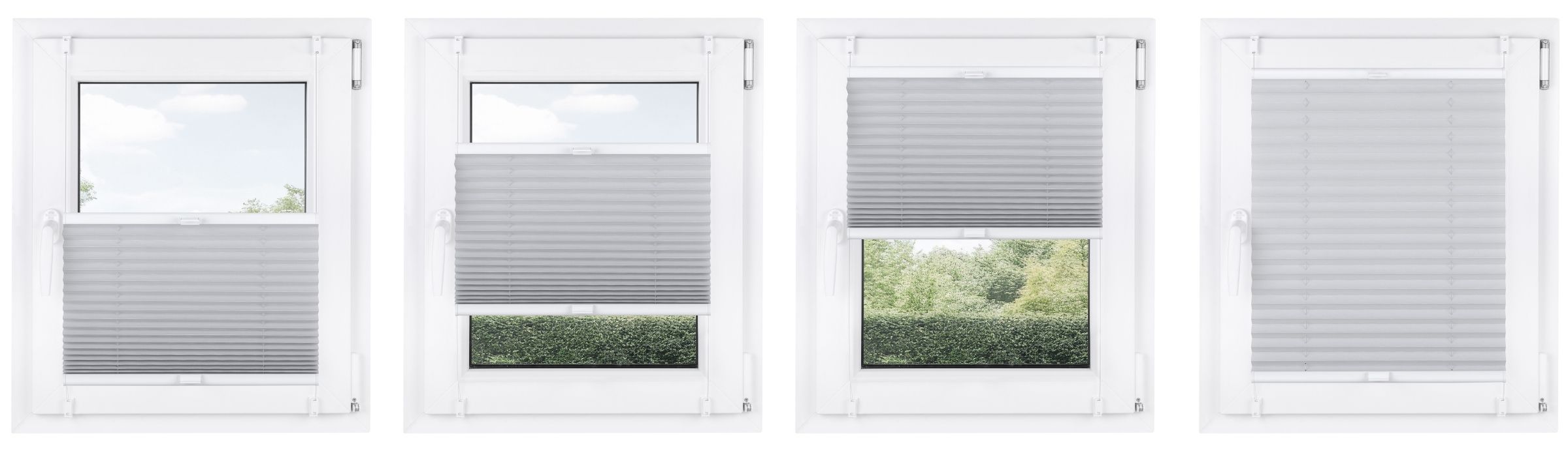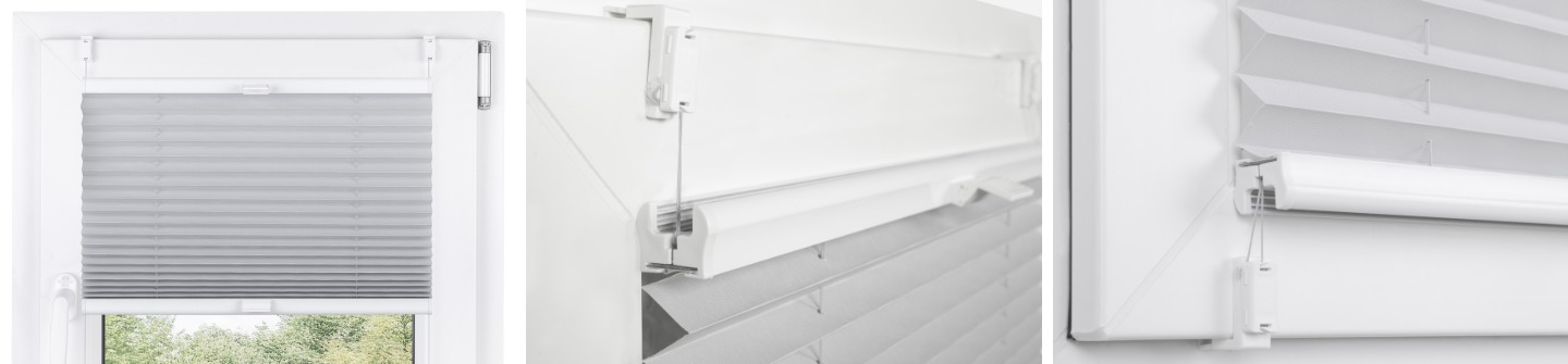 Wir montieren die Plissee am Fenster (ohne Bohren) mit Spezialgriffen 2,5 cm vom Fenster entfernt, wodurch der Öffnungsradius des Fensters begrenzt wird.