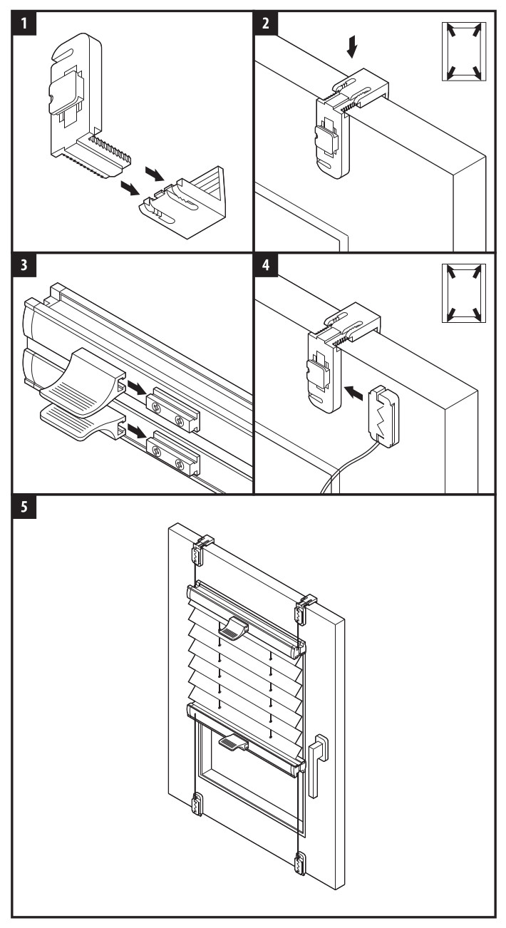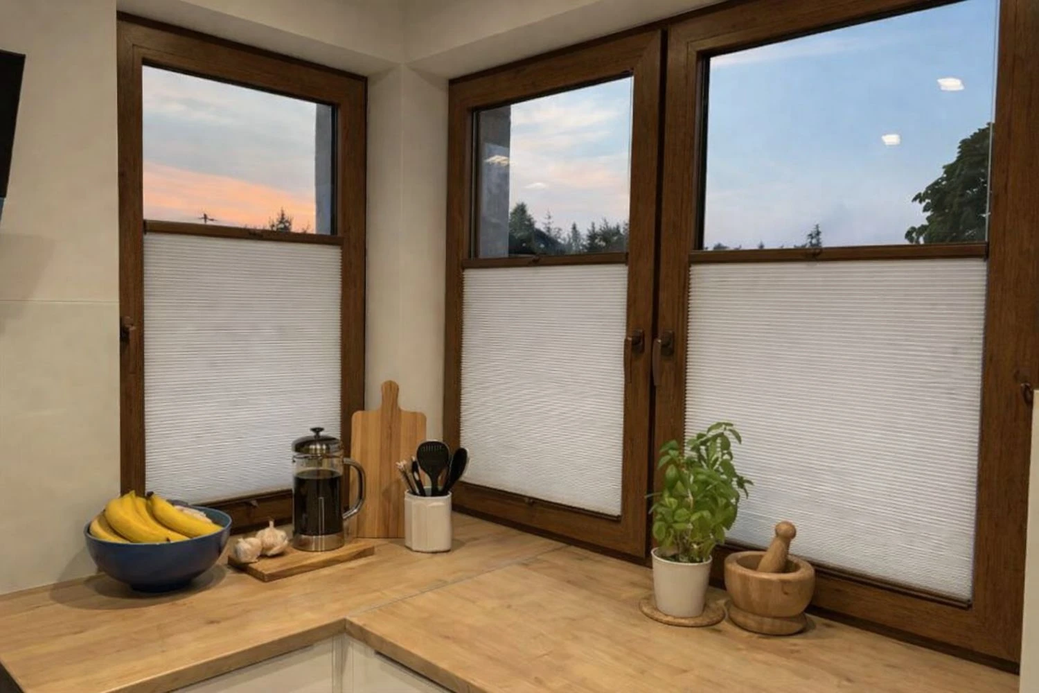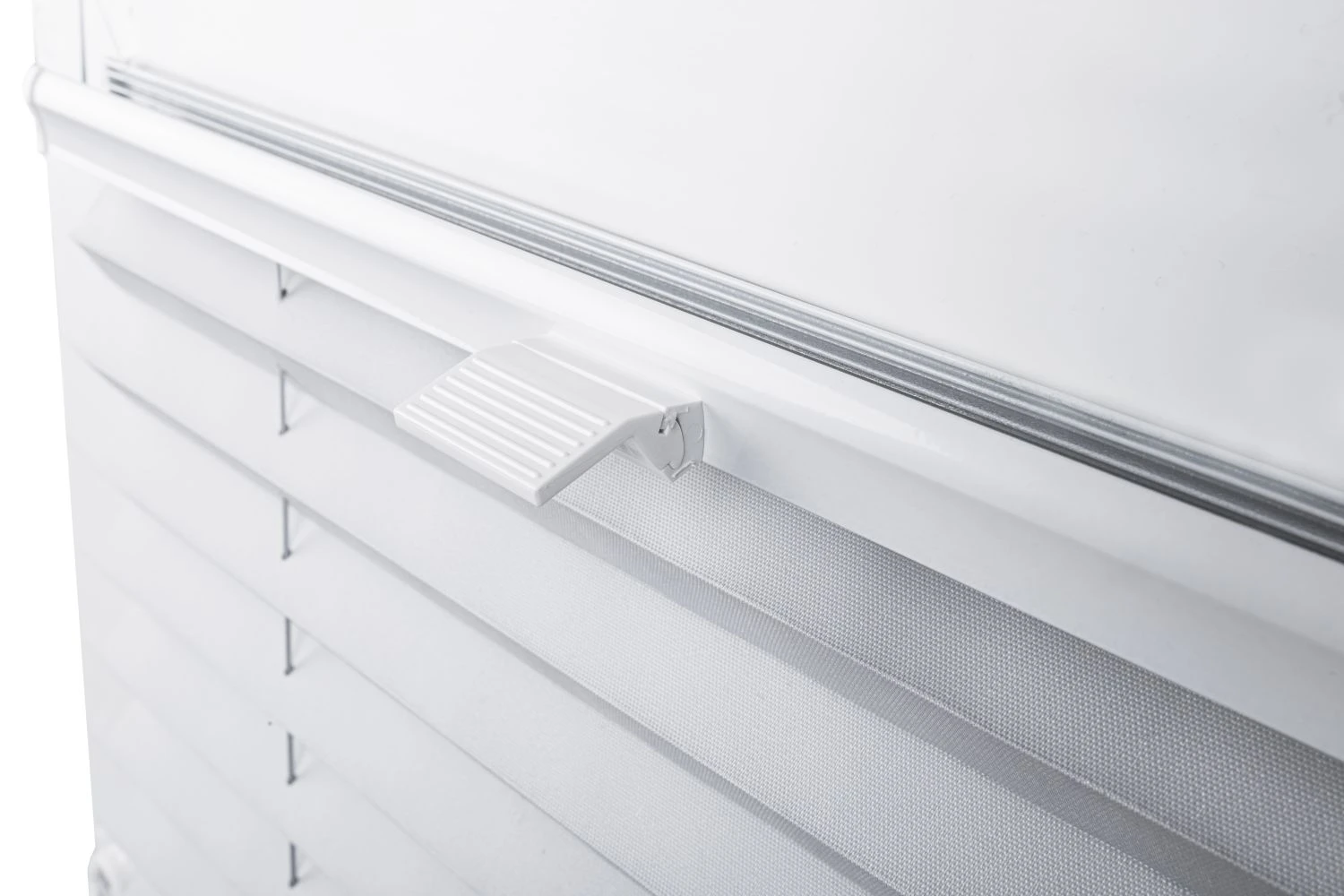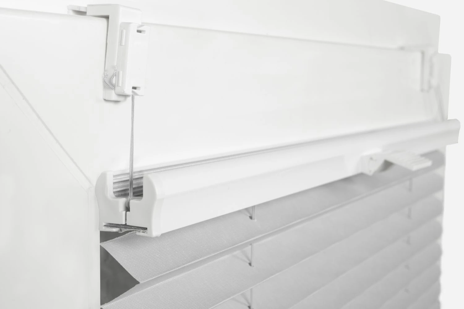 Wir montieren die Plissee am Fenster (ohne Bohren) mit Spezialgriffen 2,5 cm vom Fenster entfernt, wodurch der Öffnungsradius des Fensters begrenzt wird.