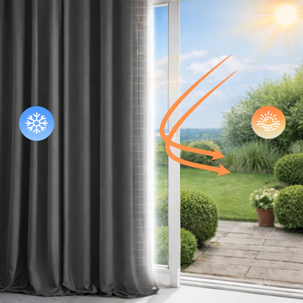 • Der Vorhang verfügt auf der Fensterseite über eine silberne Thermobeschichtung.