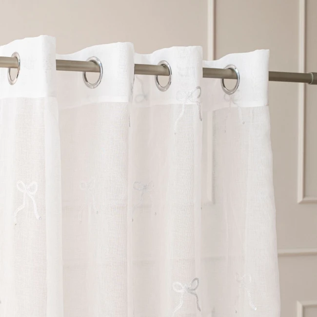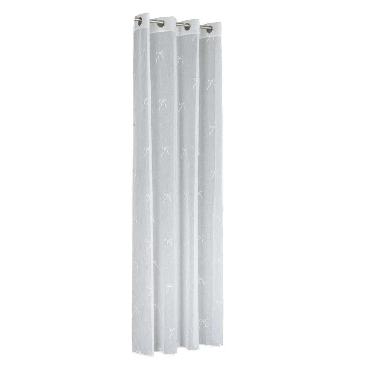 Fertige Gardine aus weißem Etamin mit feiner, kleiner Struktur, unten mit Bleiband abgeschlossen. Verziert mit dekorativen silbernen Schleifen mit funkelnden Strasssteinen. Die subtilen Verzierungen verleihen ihr einen besonderen Charakter.